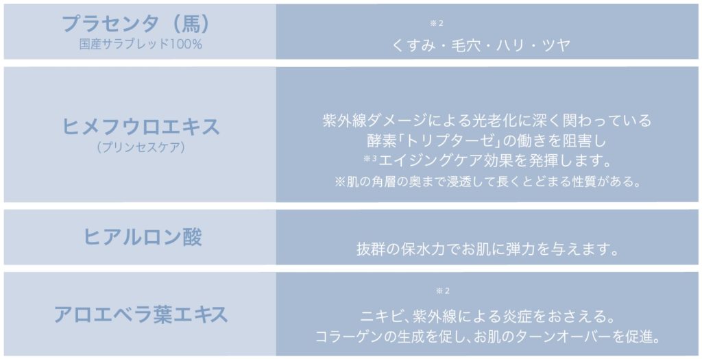 全成分/ 水、BG、グリセリン、ペンチレングリコール、プラセンタエキス(馬)、ヒメフロウエキス、 ヒアルロン酸 Na、アロエベラ葉エキス、グリコシルトレハロース、加水分解水添加デンプン、1,2- ヘキサンジオール、グレープフルーツ果皮油、PEG-60 水添ヒシマ油、ポリイソブテン、ポリソルベー ト 20、ポリアクリレートー 13、エチルヘキシングリセリン、ココイルアルギニンエチル PCA、クエ ン酸 Na、クエン酸、フェノキシエタノール